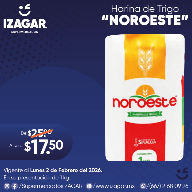 Harina de trigo Noroeste 1 kg. Adicionada con ácido fólico, zinc y hierro. Restituida con vitamina B1, B2 y B3. Especial para preparar: Tortillas, hot cakes, pasteles, donas, etc.