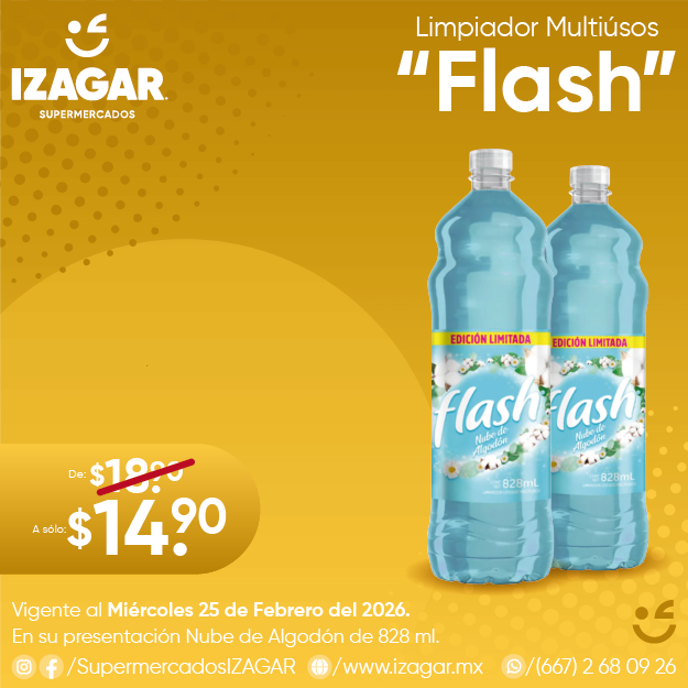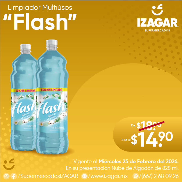 Limpia tus pisos y superficies con el Multiusos "Flash" con sus presentaciones Lavanda, Explosión de Moras, Floral y Brisa Marina de 828ml a un increíble y bajo precio en todas nuestras sucursales.
