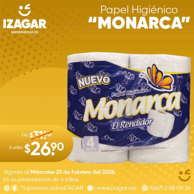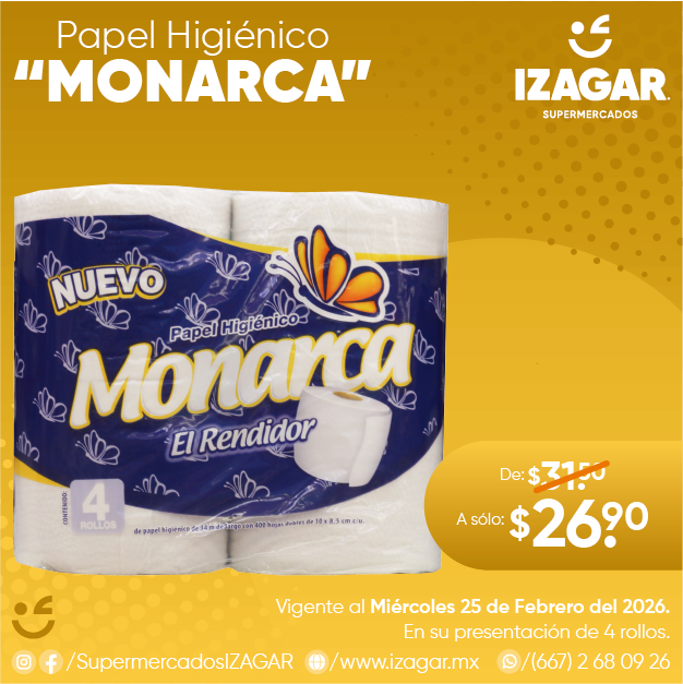 Toda la resistencia y la suavidad de los papeles higiénicos está en "Monarca" que tenemos en todas nuestras sucursales en su presentación de 4 rollos con 400 hd c/u.
