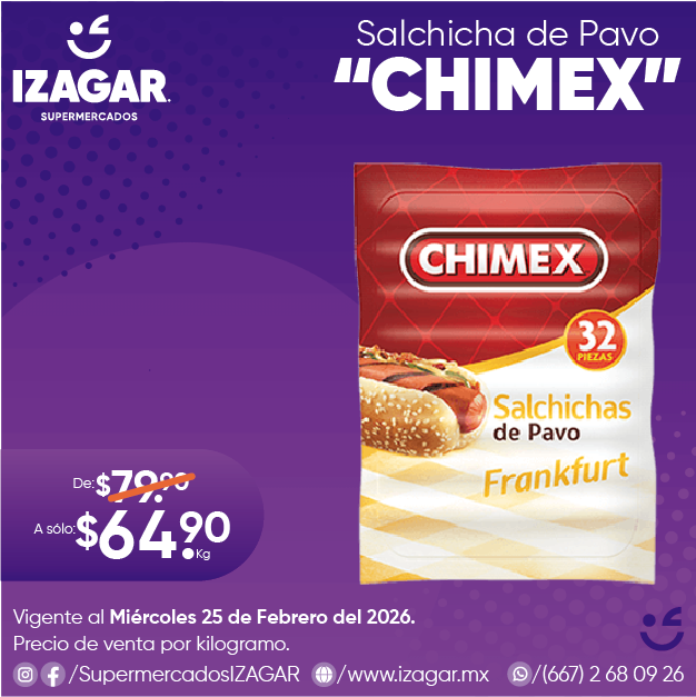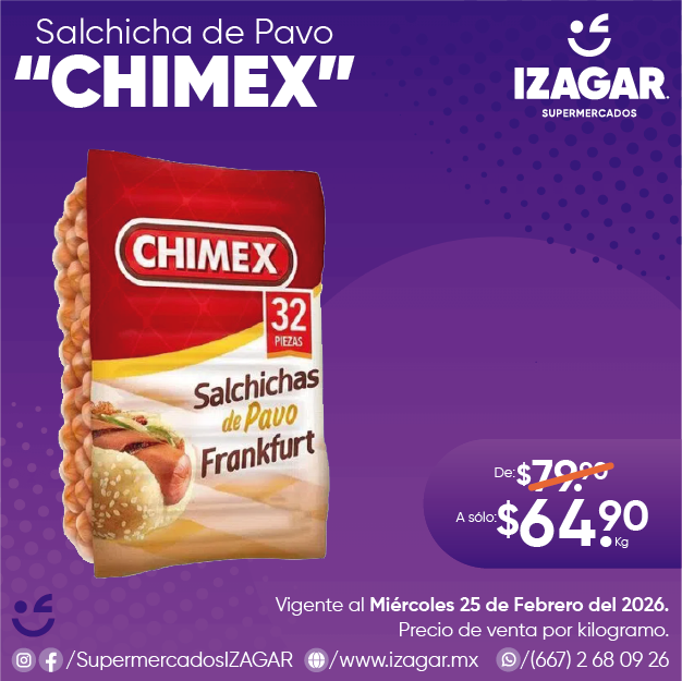 La Salchicha Pavo Chimex está elaborada con la mejor selección de ingredientes. Todos de calidad comprobada para crear el más popular y delicioso embutido. Con carne de ave y sin colorantes artificiales.